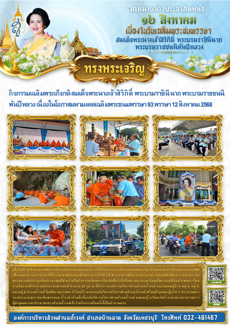 เมื่อวันที่ 12 สิงหาคม 2568 องค์การบริหารส่วนตำบลถ้ำรงค์ได้จัดโครงการจัดงานเฉลิมพระเกียรติวันแม่ ประจำปีงบประมาณ 2568 เพื่อแสดงความจงรักภักดีที่ประชาชนมีต่อสมเด็จพระนางเจ้าสิริกิติ์ พระบรมราชินีนาถ พระบรมราชชนนีพันปีหลวง และสถาบันพระมหากษัตริย์ มุ่งเน้นประชาชนมีส่วนร่วมในกิจกรรมเทิดพระเกียรติเพื่อรำลึกถึงพระมหากรุณาธิคุณที่พระองค์มีต่อปวงชนชาวไทย ภายในงานมีกิจกรรมตักบาตรพระสงฆ์ จำนวน 25 รูป ณ ที่ทำการองค์การบริหารส่วนตำบลถ้ำรงค์ และถนนหมู่บ้าน หมู่ 4, หมู่ 5, และหมู่ 6 ตำบลถ้ำรงค์ โดยมีนายบรรพต กำไลแก้ว นายกองค์บริหารบริหารส่วนตำบลถ้ำรงค์ พร้อมด้วยคณะผู้บริหาร ประธานสภา รองประธานสภา สมาชิกสภาอบต.ถ้ำรงค์ เจ้าหน้าที่องค์บริหารบริหารส่วนตำบลถ้ำรงค์ คณะครูโรงเรียนวัดถ้ำรงค์ หน่วยงานราชการ ผู้นำชุม