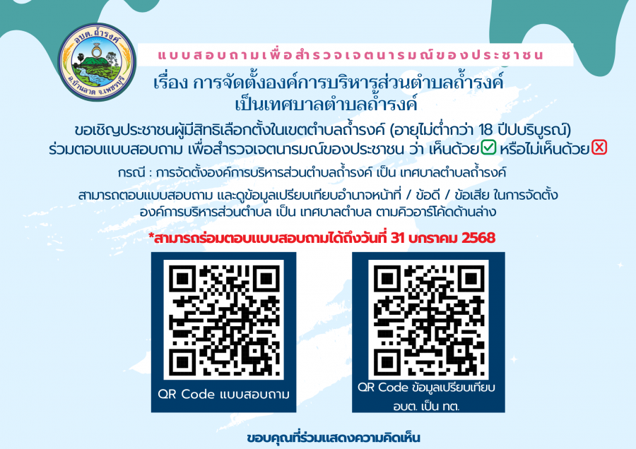 ขอเชิญชวนประชาชนในเขต อบต.ถ้ำรงค์ ตอบแบบสอบถามความคิดเห็นในการจัดตั้งและยกฐานะจากองค์การบริหารส่วนตำบลถ้ำรงค์ เป็น “เทศบาลตำบลถ้ำรงค์